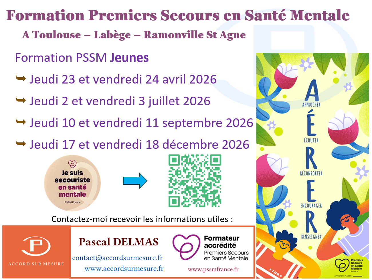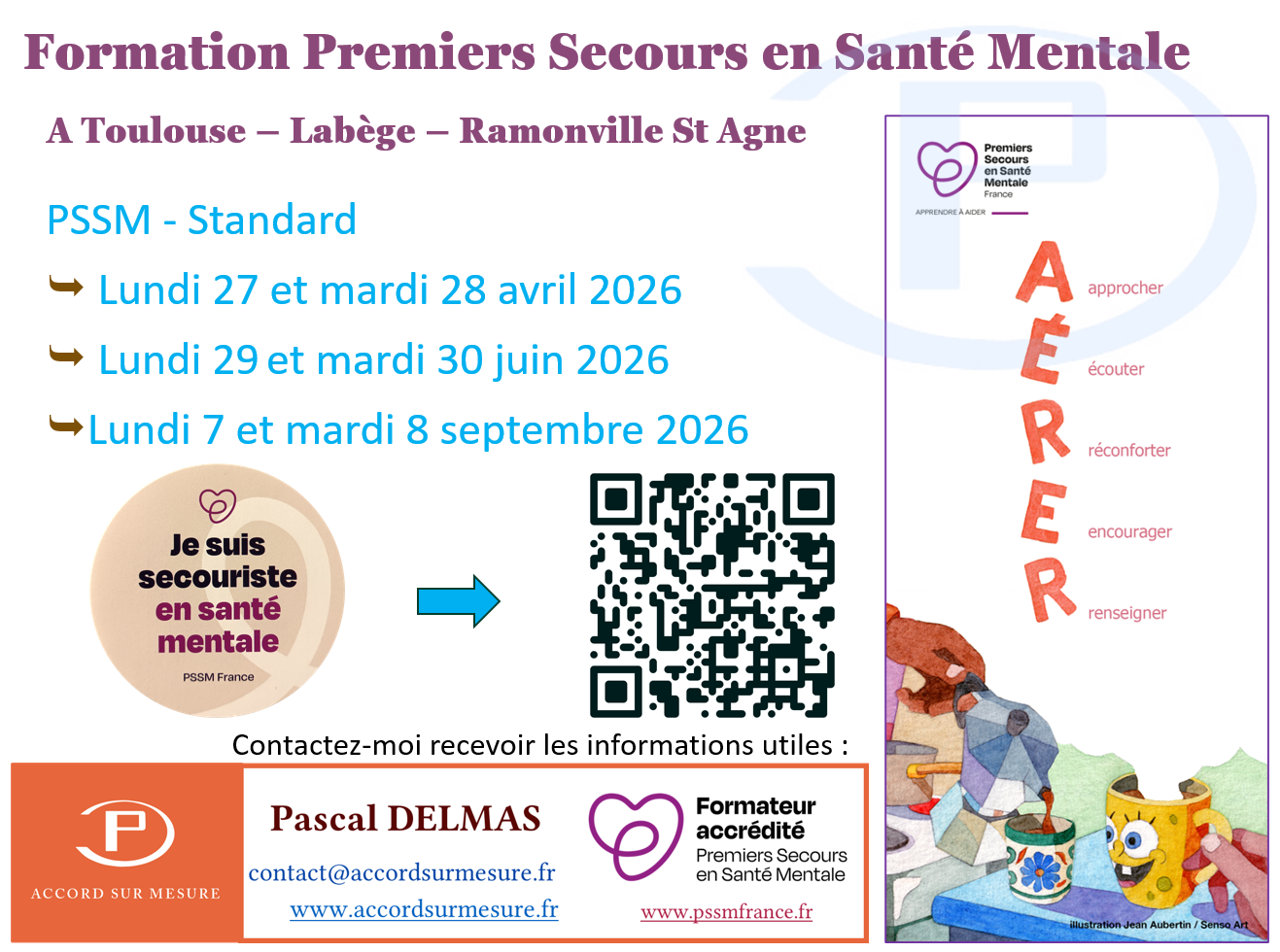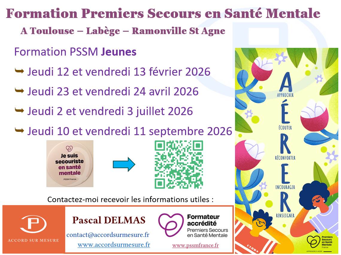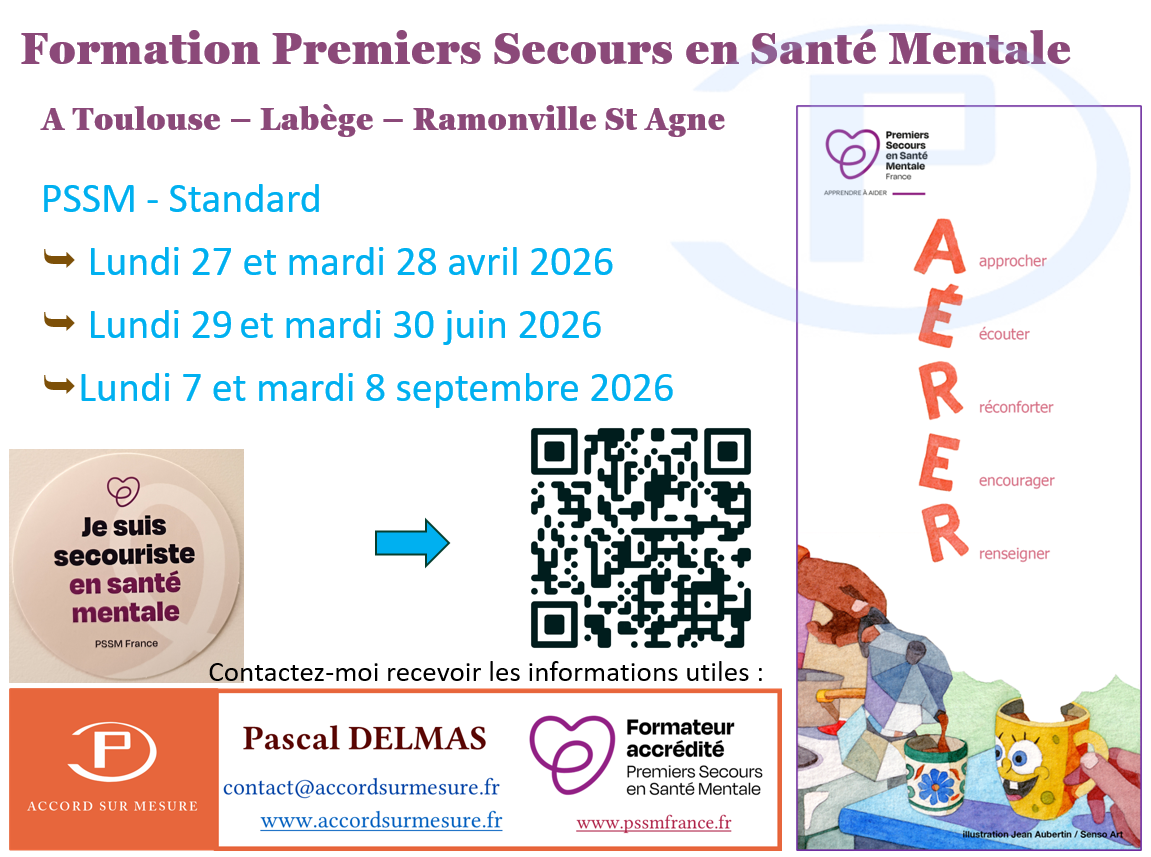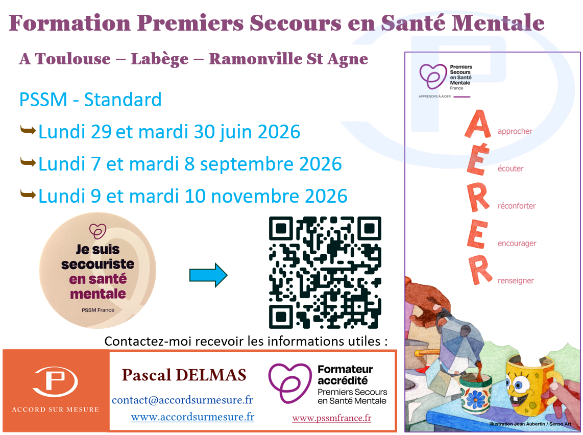 Je suis accrédité par PSSM France pour délivrer la formation à toute personne intéressée par ces questions sur la santé mentale, toute personne souhaitant contribuer à la prévention sur les troubles de santé mentale