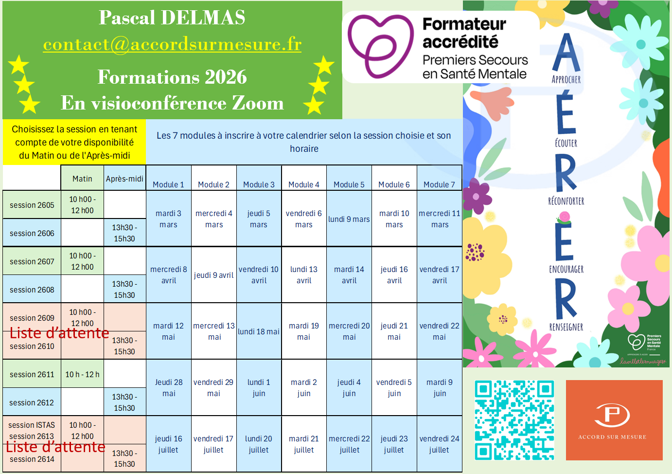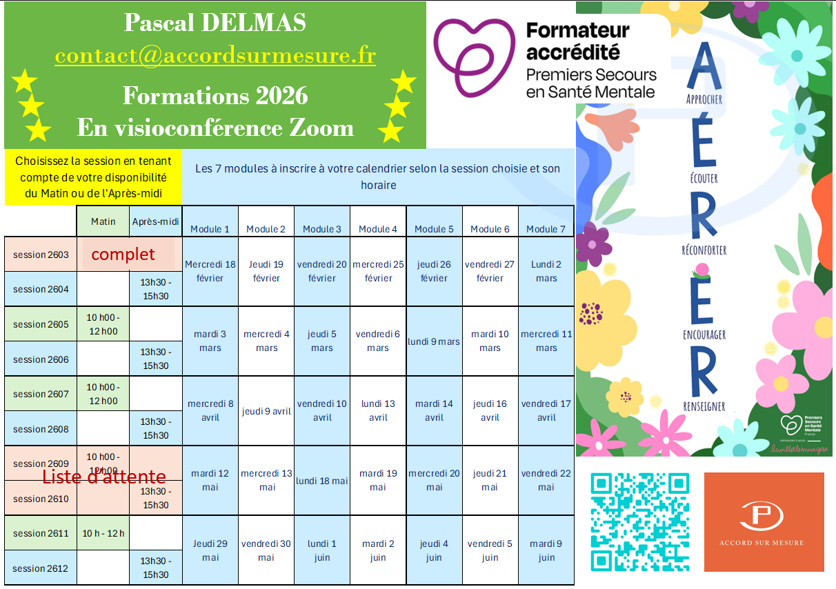 Vous retrouverez les dates de formations sur mes réseaux : LinkedIn, Facebook ou sur le site de PSSM France.