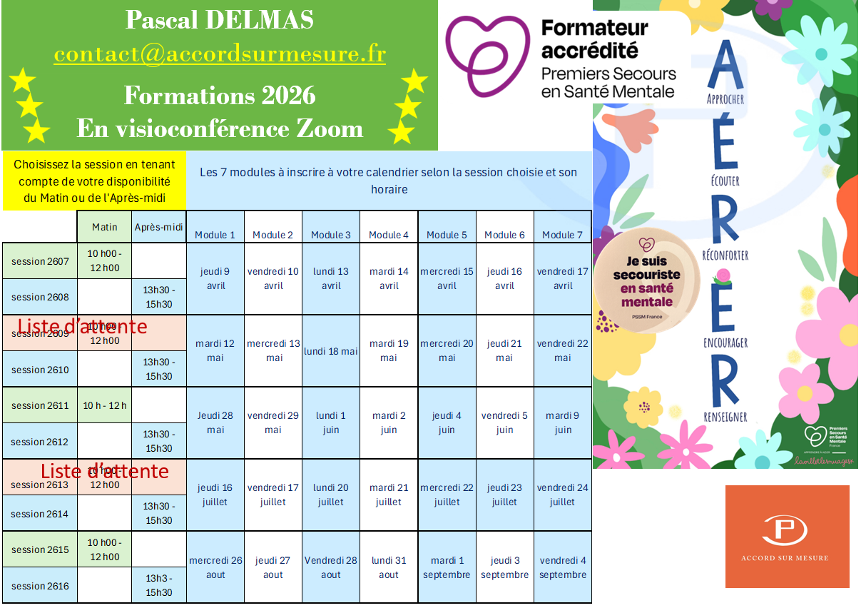 Vous retrouverez les dates de formations sur mes réseaux : LinkedIn, Facebook ou sur le site de PSSM France.